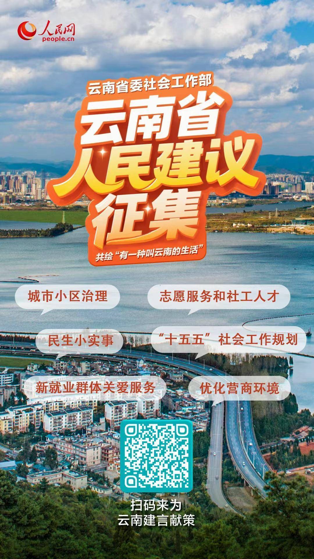 人民网昆明10月15日电 (记者木胜玉)即日起,云南省人民建议征集平台(点击进入)正式上线,面向社会各界征集关于城市小区治理、民生小实事、志愿服务和社工人才、优化营商环境、新就业群体关爱服务、“十五五”社会工作规划等方面的意见建议。